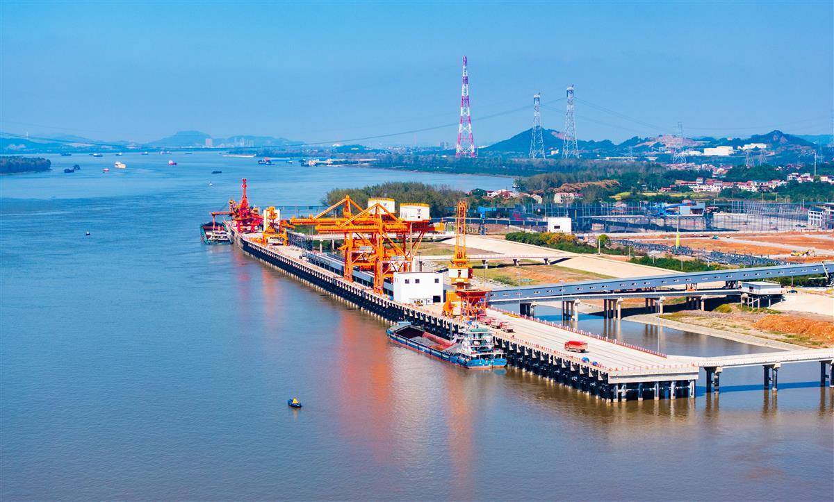 站在红色渡口广场远眺,上游不远处,武穴港区多式联运工程综合码头已轮廓分明:6个巨型泊位如钢铁臂膀般伸向水中,高耸的装船机、卸船机与门机正在加紧吊装,一座“钢铁森林”在昔日红色热土上拔地而起,静候通航。